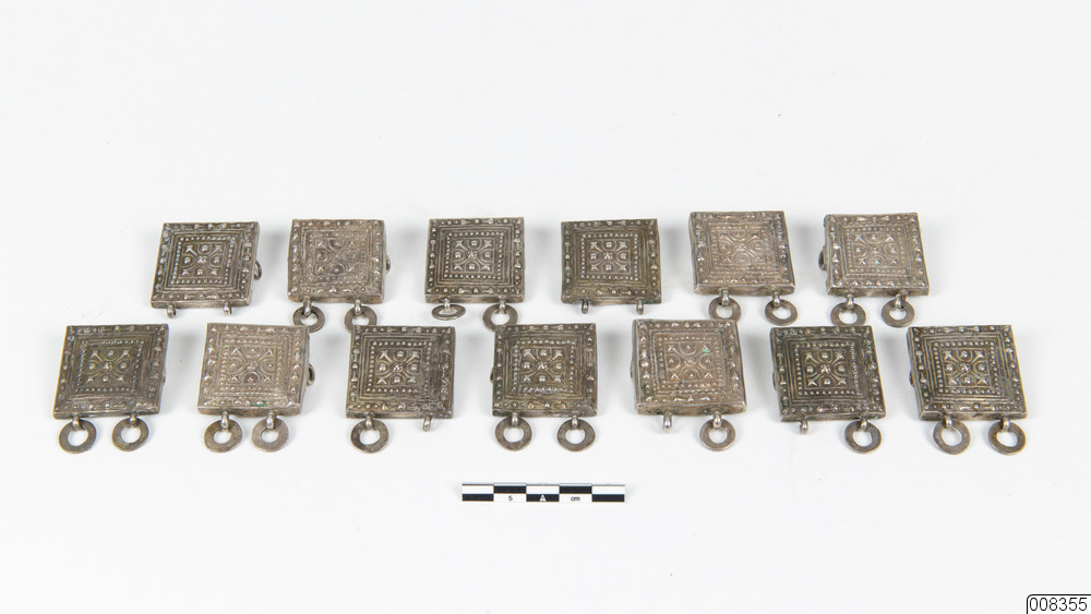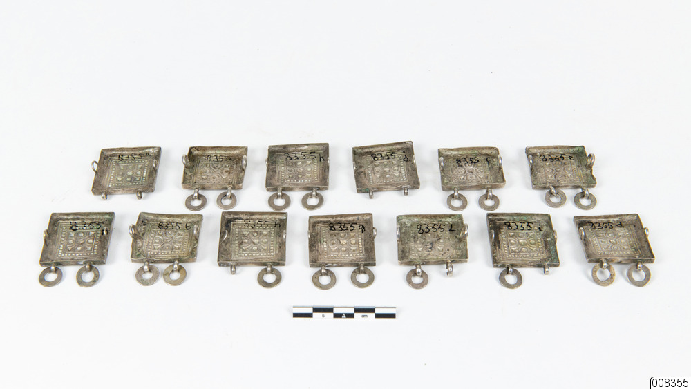 Beslag. Bältesbeslag av ostämplat silver. Kvadratiska med två platta ringar som hängen nedtill. Dekor: Kvadrater, ringar m.m. (rosettornering). Antal 13 st.