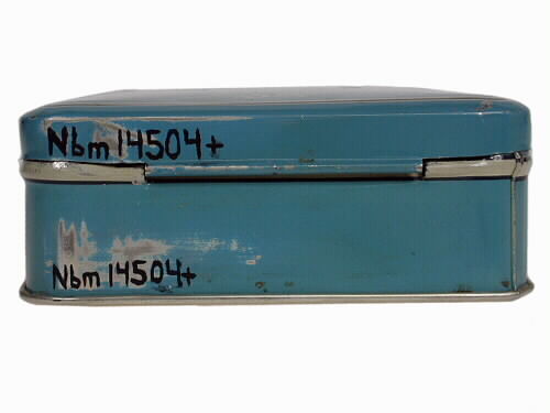 Ask. Ljusblå ask med avtagbart lock. Både på lockets ut- och insida finns följande text: Pastill´s Franska Linser med pepparmynt. H.M. Konungens Hovleverantör H.K.H. Kronprinsens Hovleverantör. Följande står på askens underdel: Ahlgrens (A.B. Pastill), Gävle. Asken är ofärgad invändigt. Antal delar: 2 st.