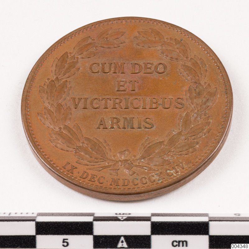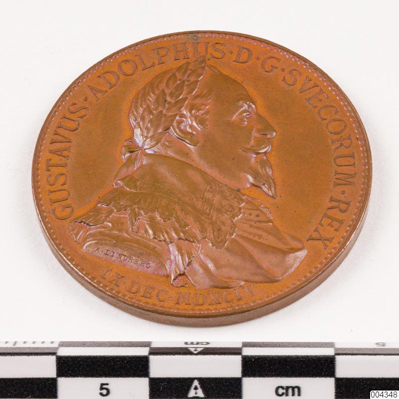 Minnespeng av brons med Gustav II Adolfs bild till 300-årsminnet av Gustaf Adolfs födelseår 1594-12-09. Text: "Cum deo et vietrius armis". Utförd av A Lindberg.