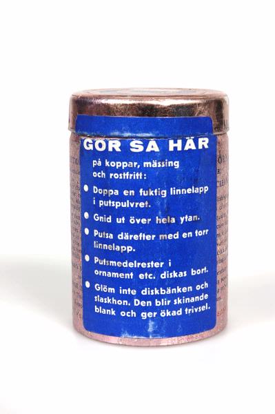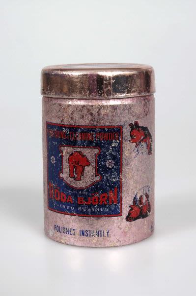 Pappburk i skär metallic-färg. På burkens framsida finns det ett fyrkantigt blått fält där det står: "POLISHING & CLEANING POWDER RÖDA BJÖRN" med röd text samt ett motiv föreställande en röd björn på en silverfärgad bakgrund. På baksidan finns en bruksanvisning på engelska, med en röd teddybjörn som putsar olika metallföremål. Den har dock delvis täckts av en påklistrad blå lapp med en bruksanvisning på svenska tryckt med vit text.