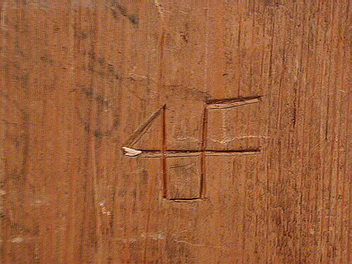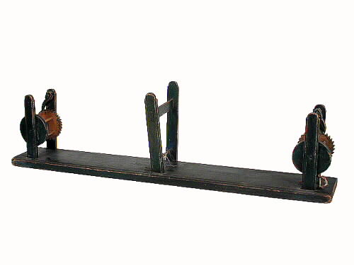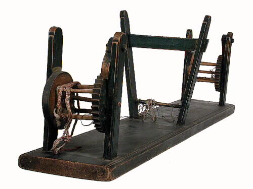 Bandvävstol. Mörkblåmålad bandvävstol. Bomärke.
