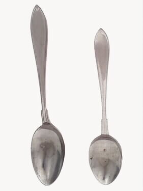Sked. 2 st skedar, en matsked och en dessertsked av modell råttsvans. a. Matskeden märkt: "Gense rostfritt stål". b. dessertskeden märkt: "Rostfritt stål import".