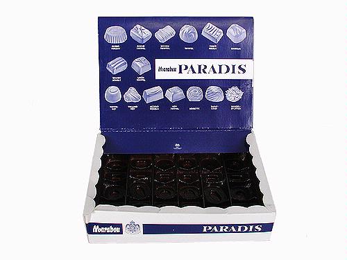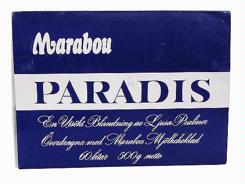 Framsidan och gavlarna är vita och delade med en vågrät blå rand. På randen står med vit text: "Marabou PARADIS". På framsida finns också det stora svenska riksvapnet i blått med text: "KUNGL. HOVLEVERANTÖR".
