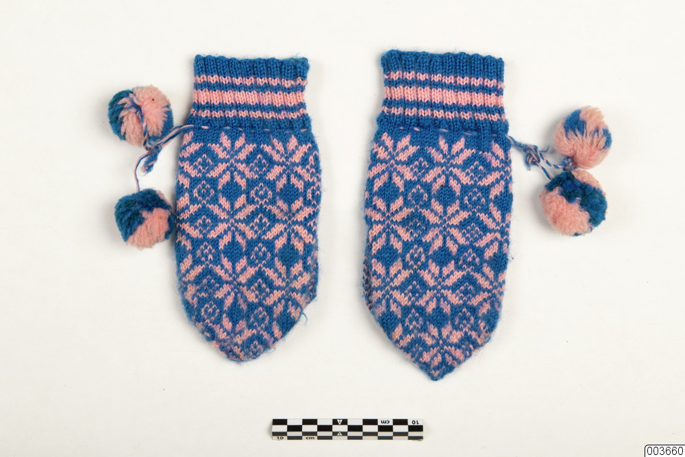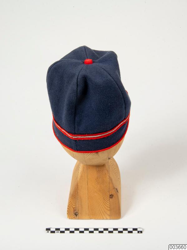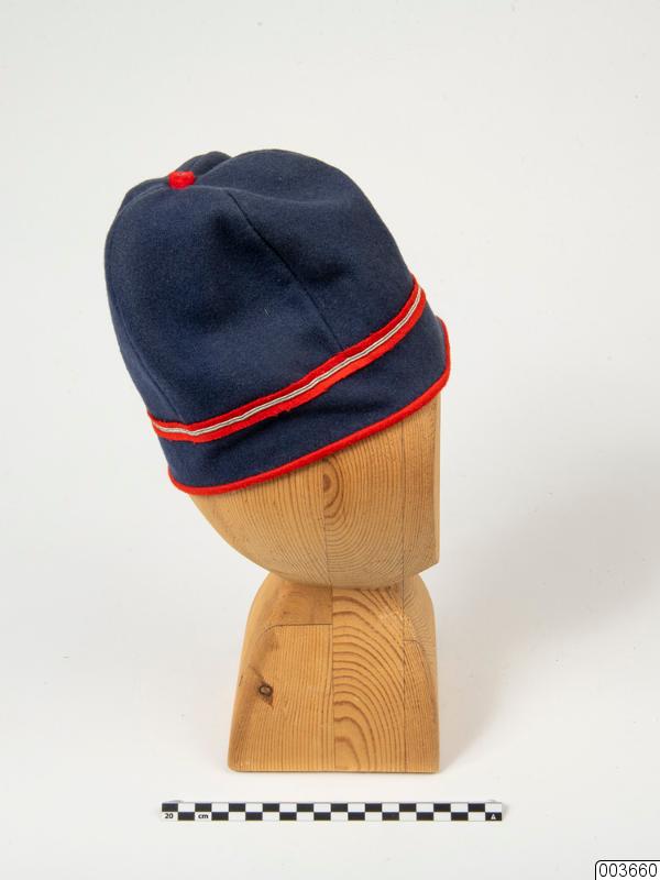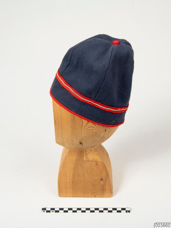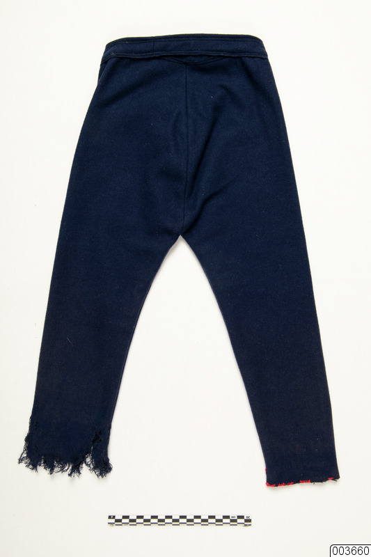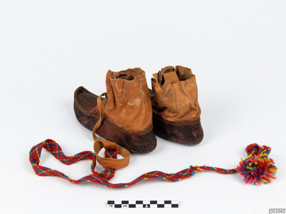 Flickdräkt. Samisk flickdräkt bestående av: a) Klädeskolt, b) byxor, c) skärp, d) mössa, e) bröstkläde, f) halsduk, g) skor med skoband, h) hårband, i) vantar. Antal delar: 9 st.