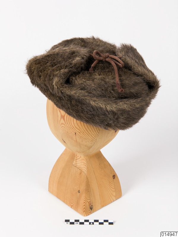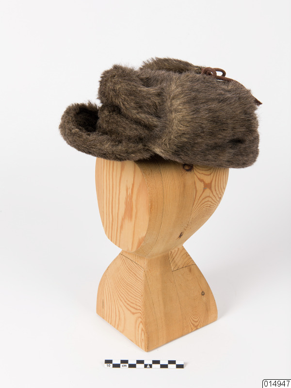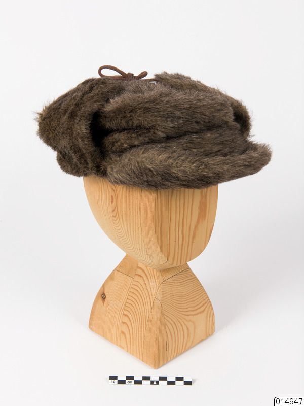 Skärmmössa. Mössa med skärm, öronlappar och hakband. Den är gjord av brun-svart luddigt skinn och har foder av brunt rutstickat nylontyg. Mössan är märkt: "Vinson", evighetskringla "kläder för karlar".