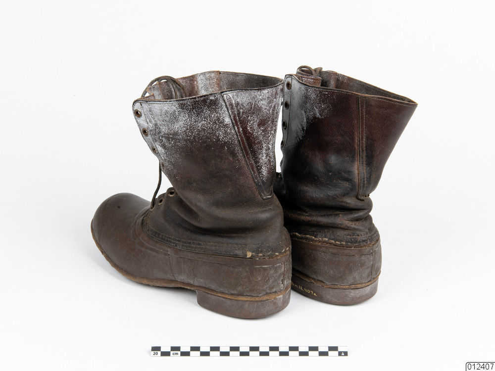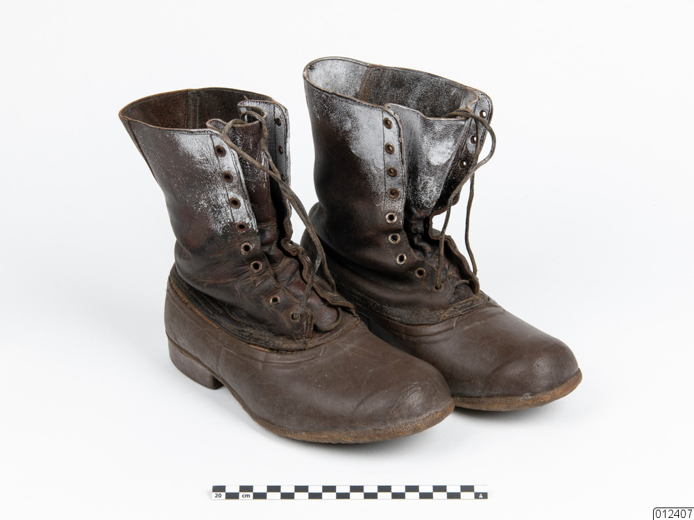 - Känga. Ett par bruna kängor med slät gummisko samt läderskaft med fastsydd plös och hålsnörning. Läderremmar.