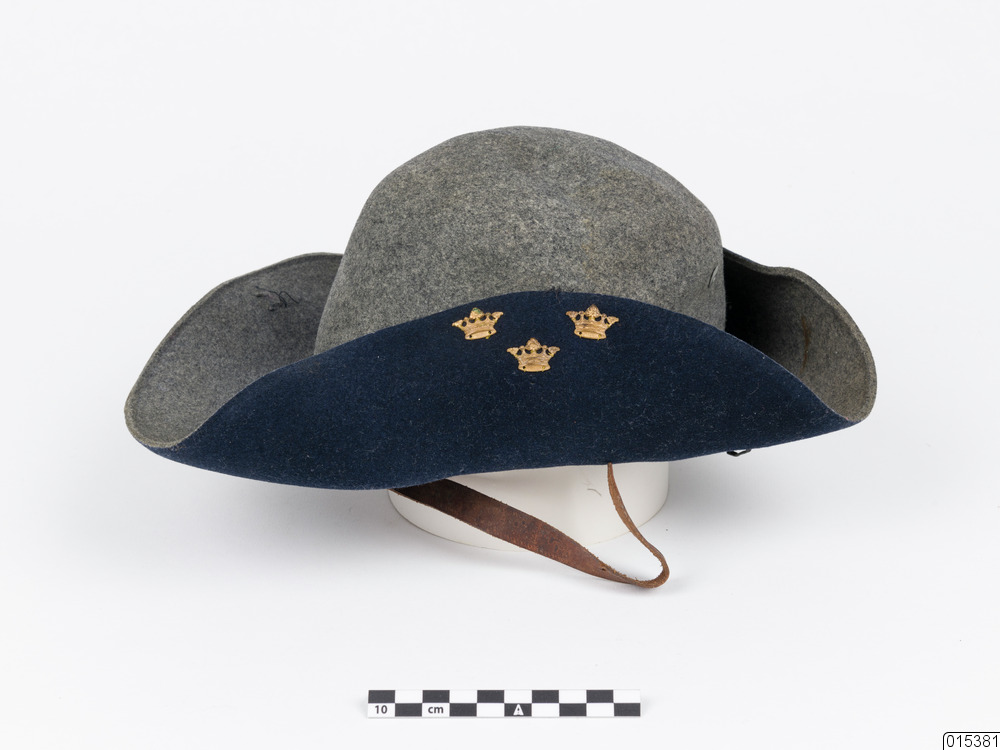 - Grå "trekantig" mössa. Brättet uppvikt. Blått på insidan. Tre kronor av gulmetall är fästade på vänster uppvikta brätte. Snodd runt kullen. Två metallskodda hål på kullen. Svett- och hakband av läder. En filttamp är fastsydd i kullen.
