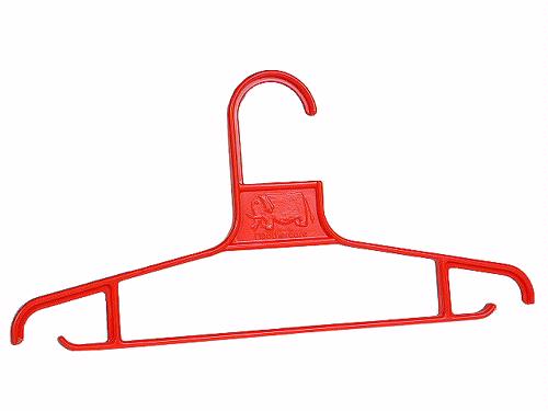 Galge gjuten av röd plast. Galgen har upphängningskrok samt tvärslå för byxupphängnig. Galgens armar är jämntjocka samt böjda nedåt vid ändarna. Galgen är på ena sidan dekorerad med en elefant i relief. Galgen har text, "mothercare".