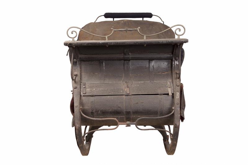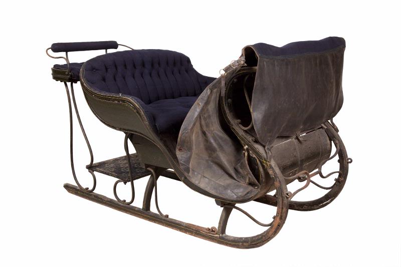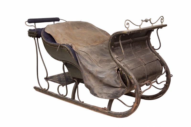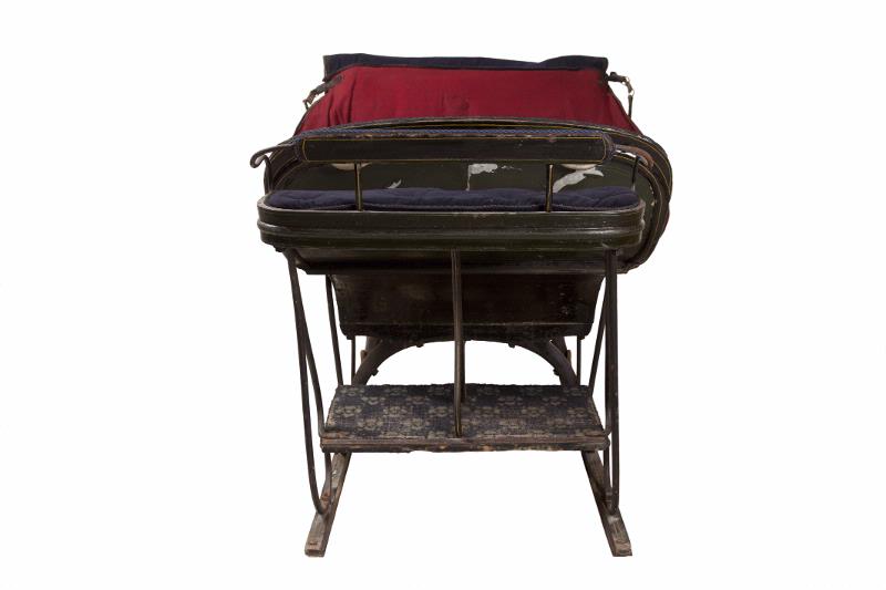 Släde. Grön promenadsläde med uppsvängt framparti och kuskbock baktill. Invändigt madrasserad. Diverse handtag i mässing.