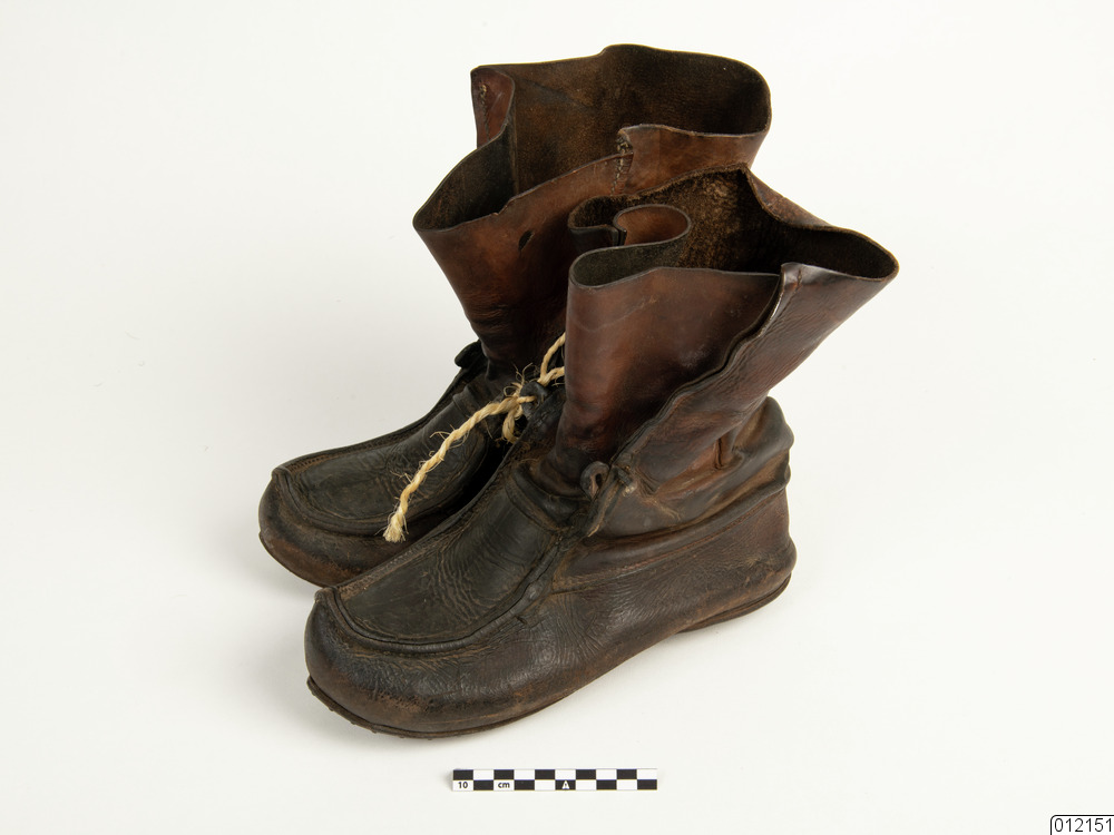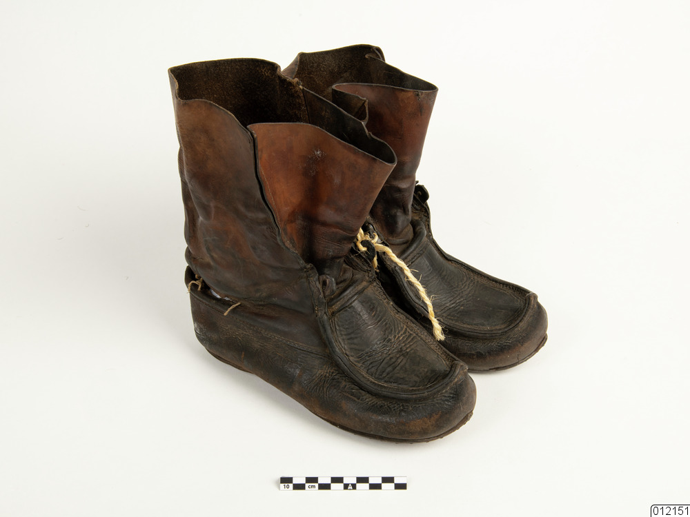 - Näbbsko av kraftigt brunt läder med pliggade trä sulor. Kängsko med upphöjt tåparti med plös i ett stycke. Sulorna i två delar.