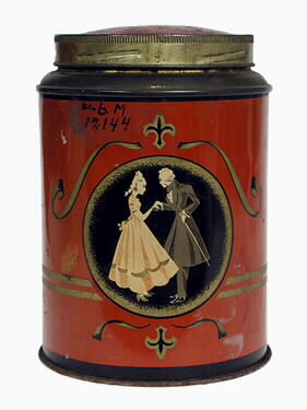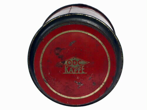 Kaffeburk av plåt. Rödmålad, ornerad kaffeburk, märkt ODC KAFFE.