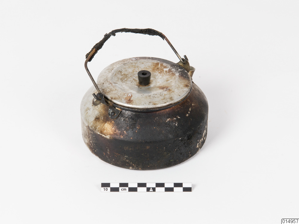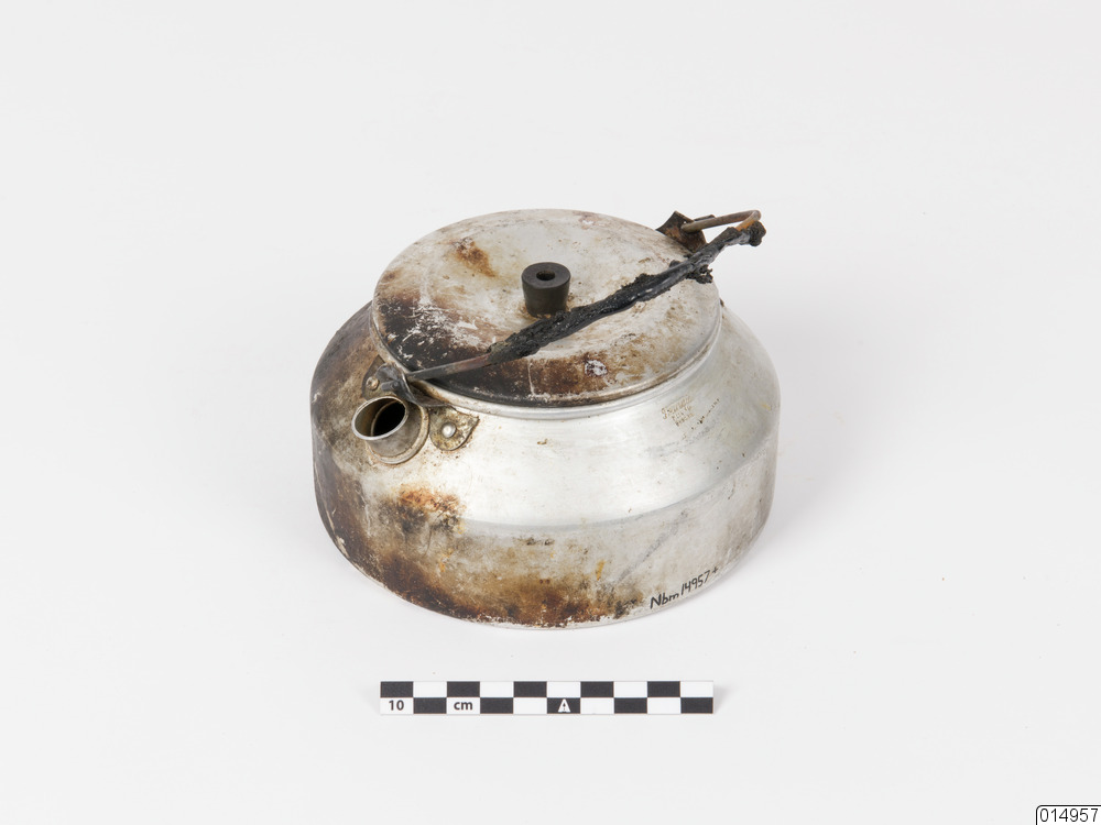 Kaffepanna. Platt kaffepanna med lock, kort pip och handtag med rester av plastöverdrag. Märkt, graverat: Trangia Made in Sweden. Antal delar: 2 st.