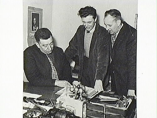 Bengt Lidström, sågverksägare i Moskosel. Här på sitt kontor tillsammans med kamrer Paul Lundman och en försäljare.
