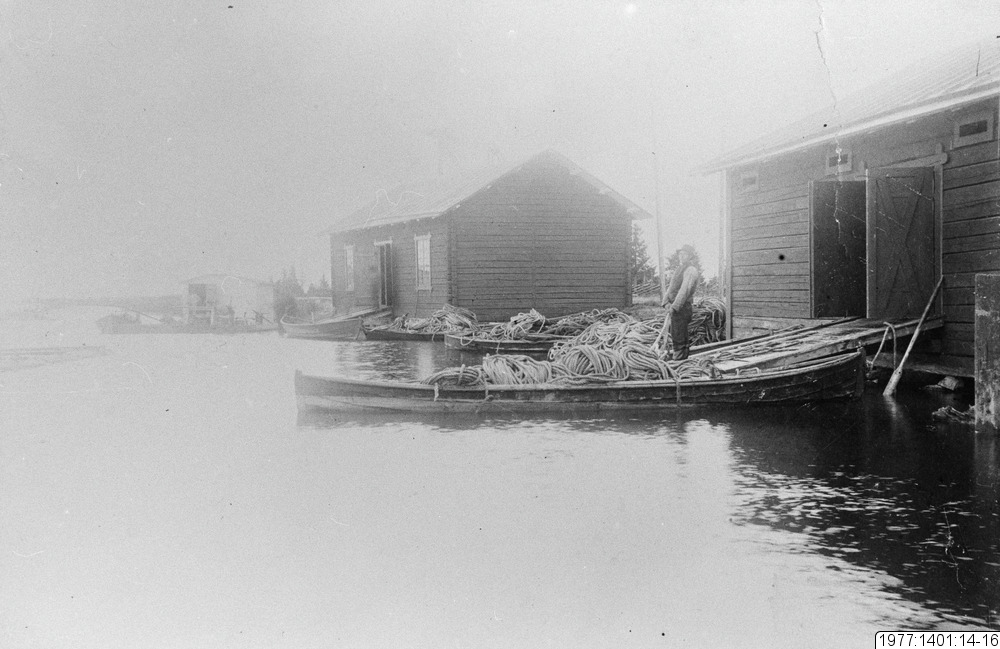 Sjöbodar samt båt med redskap och rep till laxpator.