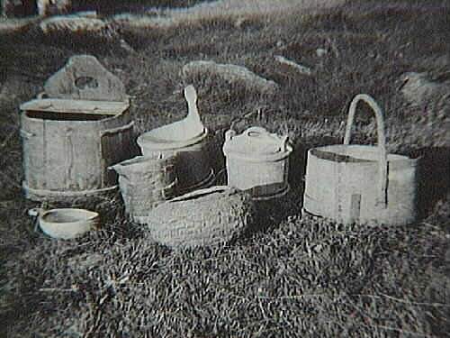Gamla husgeråd av näver, spån, rot och trä. Mjölvacke, stäva med träband, smörbytta och såskäppa, skopa, näverask och korg av flätade rottågor.