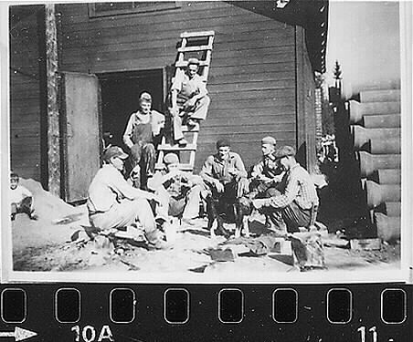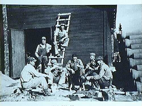 Kafferast i Ohtanajärvi Cementgjuteri. Fr. v sittande Karl Skogsdahl, Åke Hannu, Bertil Vanhatalo, Reinhold Kero och Fritjof Johansson. Stående vid stegen okänd, Gunnar Bergstöm sittande på stegen.