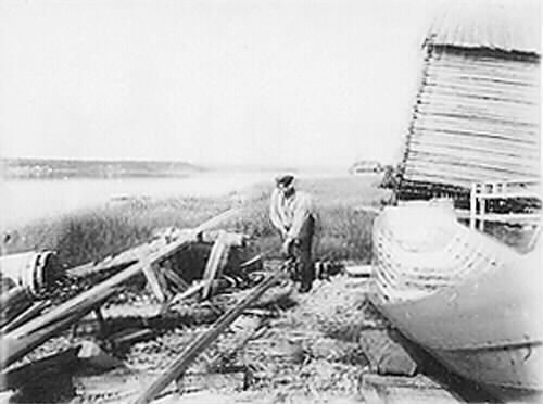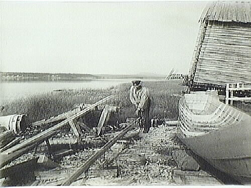 Nämndeman J H Fjällborg bygger en båt för utombordsmotor. J H Fjällborgs gård. Till vänster sjön Jukkasjärvi.