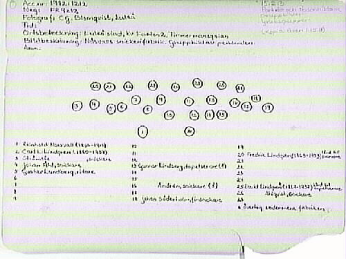 Mittersta raden från vänster: Strömsöe, snickare, Johan Åhl, snickare, Gustav Lundberg, ritare, okänd, okänd, okänd, okänd, okänd, okänd, okänd, Gunnar Lindberg, tapetserare (?), okänd, okänd, Andrén, snickare (?), okänd, Johan Söderholm, finsnickare, okänd.