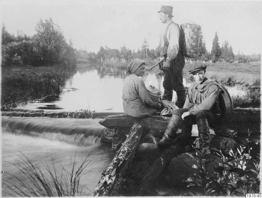 På väg till myrslåttern. I konten förvarades allt möjligt av matvaror. Kvinnan har en smörbytta i knäet. Pojken, Werner Mäkitalo, har en leili med filmjölk. Bilden är tagen vid Kangosforsen, 1920-talets början.