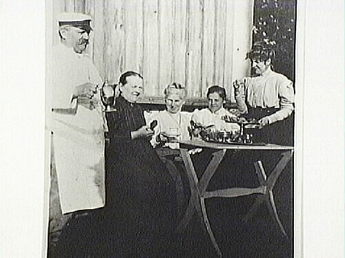 Gruppbild, fr.v: Herr och fru Forslund, fru Bohman, fru Marklin och fröken Agda Bohman. Sällskapet sitter utomhus och dricker kaffe med kaffebröd. Stationsgatan 29.