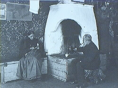 Plåtslagare Karlsson och hans gumma i gamla "tingshuset" vid spisen. Karlsson var smålänning som på äldre dagar mest sysslade med agenturaffärer.