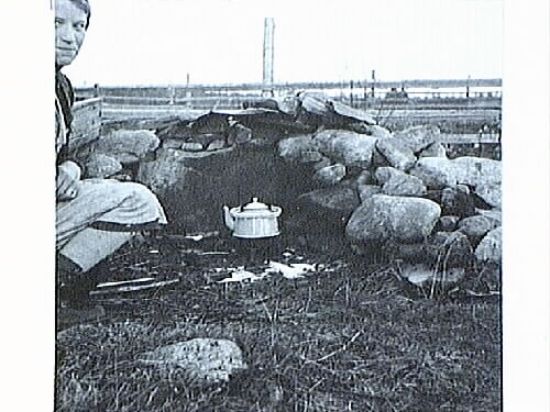 Sonja Kuoppala kokar kaffe i uteugn. Den användes även till matlagning och bakning. Kangosfors.