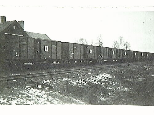 Järnvägsvagnar fraktar offren från Armasjärviolyckan då 46 man omkom genom drunkning.