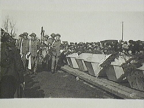 Zinkkistorna med liken av de i finska frihetskriget stupade svenskarna placeras på perrongen vid Haparanda hamnstation, där en högtidlig minnesgudstjänst förrättades af kyrkoherde Karnell, innan de vidaresände söderut.