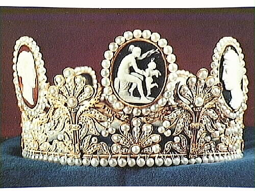 Kamédiadem, sannolikt tillverkat i Paris för franska kejsarinnan Josephine vid 1800-talets början. Kom senare att tillhöra kejsarinnans sondotter, Drottning Josefina av Sverige.