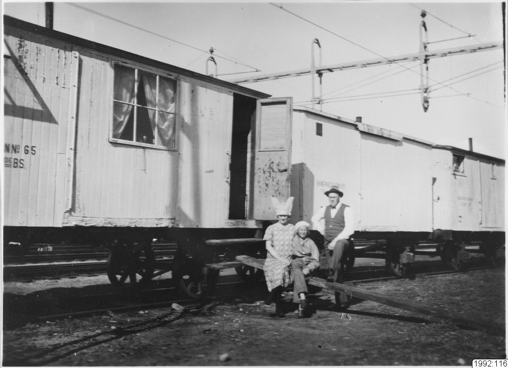 Två kvinnor samt en man utanför vagnen.
