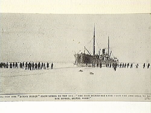 - Engelska fartyget "Juana Nancy", som sågades och sprängdes ut genom isen från Luleå, december 1888. Bildtext: "Cutting out the "Juana Nancy from Lulea to the sea - "The poor pesantry came from far and near to do the bitter, dismal work."