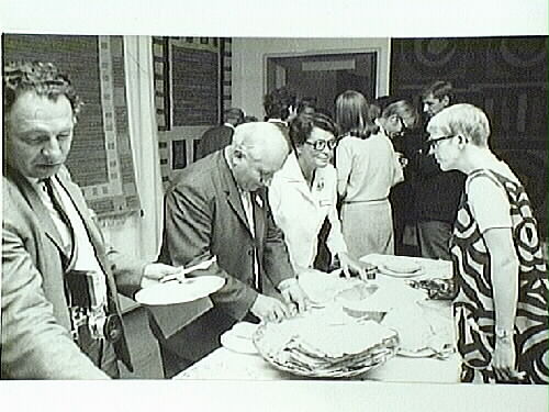 Nordkalottkonferensen på Norrbottens museum i augusti 1968. Andra från vänster rektor Adrian Wennström. Till höger Magdalena Forsberg som utspisar de hungriga gästerna.