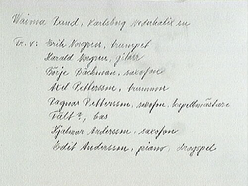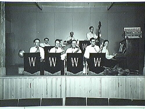 Från vänster: Erik Norgren, trumpet, Harald Norgren, gitarr, Börje Bäckman, saxofon, Axel Petterson, trummor, Ragnar Pettersson, saxofon, kapellmästare, Fält?, bas, Hjalmar Andersson, saxofon, Edit Andersson, piano, dragspel.