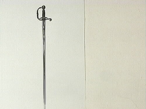 - Värja före rengöring. Värjan är från tiden 1650-1660 och är tillverkad i Tyskland. Klingan är från Solingen, stämpeln på densamma är troligen en förvanskad spansk kvalitetsstämpel. Klingan och fästet tillverkades med all sannolikhet samtidigt.