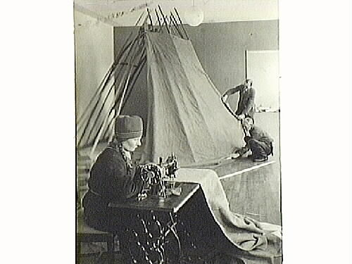 kåta, tältkåta, bågstångstyp, utställning, basutställning, sömnad, symaskin