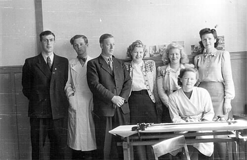 En del av personalen på länsarkitektkontoret i Luleå år 1947. Från vänster: Gunnar Josefsson, Curt Lauri-Lundberg, Sven Elander, Gunhild Holmqvist-Hedman, Ethel Hjalmarsson-Hansson och Elsa Svensson. Sittande: Annikki Sipilä-Karhu från Helsingfors.