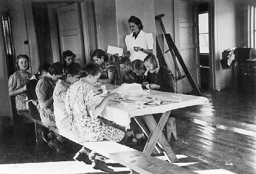 Slöjdtimme i skolan. Läraren heter Anna Johansson. Medsols runt bordet sitter Elisie Nilsson, Svea Kero, två stycken okända, Märta Kero, Margit Cullblom, Sigrid Kero, Meimi Uusitalo, Sigrid Johansson och Elsie Heikki.