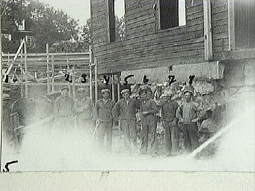 Ombyggnad av skolan, 1936. Från vänster: 4. Oskar Nilsson, 5. Sven Pettersson, 6. Karl Johansson, 8. Oskar Jonsson.