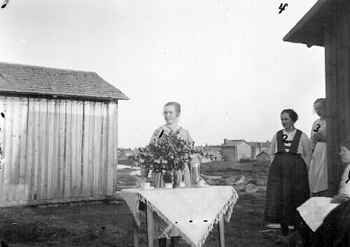 1. Berta Nordlund, gift Nordström, Ale, 2. Emelia Wikström, fotografens syster, gift Pettersson, 3. Fia Jonsson Alvik (Väst) ute på Alviks fäbodvall ca 1920.