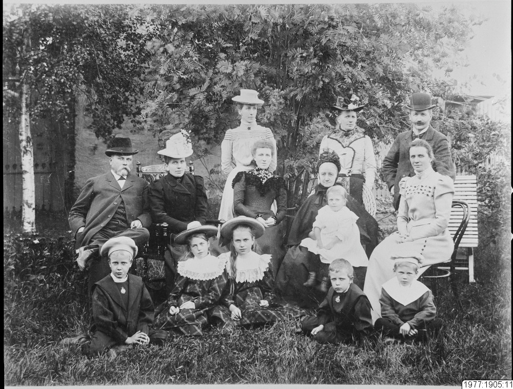 Sittande på stolar: Fadern, landssekreterare Alrik Pipon, modern Hildegard Pipon, född Burman, mostern Amanda Tanner, född Burman, mormodern prostinnan Hanna Burman, född Sundström, med systern Elin i knäet, mostern Lotten Burman.