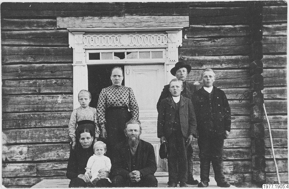 Bild 1. Familj i Anttis framför gårdens portal med tydliga norska stildrag.