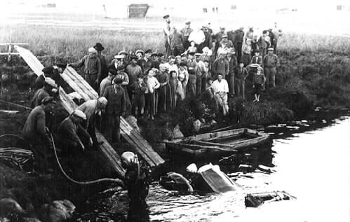 Här kommer Fritz Olssons bil upp ur det våta, till bybornas stora förnöjelse. Aleån.