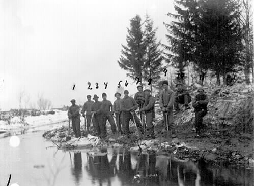 Från upprensningen av den sk "Mårtisbäcken" i Ersnäs på 1920-talet. 2. Fridolf Nyström, 5. Sivert Lindvall, 7. Paul Fransen, 8. Ivar Lundström, 9. Lunström, 11. Fabian Åström.