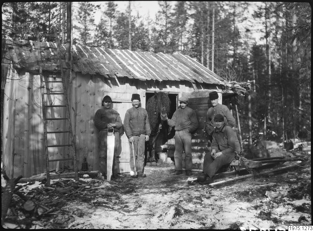 Timmerkoja och stall på Långnästjärnheden. Från vänster: Signar, fadern Axel, Ragnar, farbrodern August och Hilding Sandström Långnäs, år 1929.
