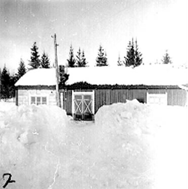 Adolf Hjorts ladugård i vinterskrud på 1940-talet.