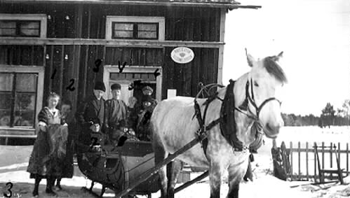 Hos Johan Häggström i Långnäs i slutet av 1920- eller början av 1930-talet. Evangelister i fotsida vargskinnspälsar. 1. Ester, 2. Ingeborg, 9. Johan - alla Häggström.