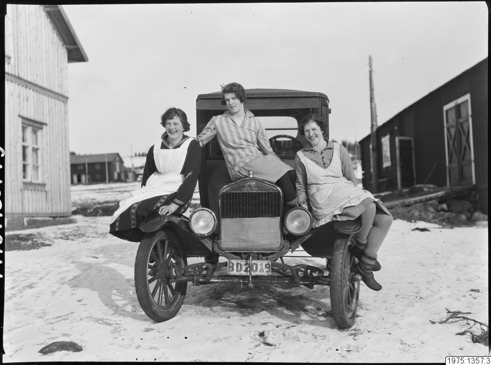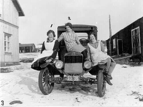På "Klobb-Albin" Nilssons bil vid "Stäfan" i Alvik. 1. Märta Eriksson, 2. Karin Lindström, 3. Thyra Vikström.