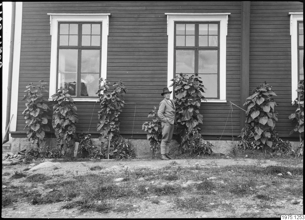 Folkskollärare Helmer Hornberg vid skolan i Alvik, omkring 1930. Solrosorna vittnar om Hornbergs intresse för blomsterodling.