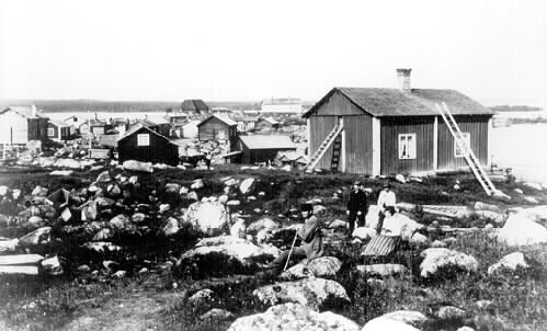 Handlande J. Edholm bodde i gården och hade gästgiveri. Arjeplogs kyrka i fonden till vänster.