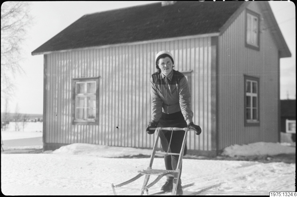 1975:1324:6 :: porträtt, kvinna, spark, bostadshus